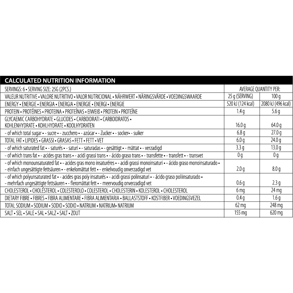 Ingredients: Wheat flour, sugar, vegetable fat & oil (palm, rapeseed), speculaas spices, glucose-fructose syrup, egg, raising agents (sodium bicarbonate, ammonium bicarbonate), salt, mono- and diglycerides of fatty acids, potato starch, sunflower lecithin, cinnamon, citric acid.