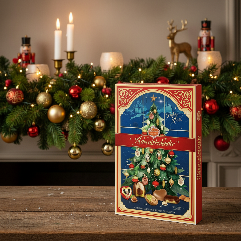 24 individually foil wrapped dark and milk chocolate with hazelnut praline with pistachio marzipan and marzipan pieces 1 behind each of the 24 doors