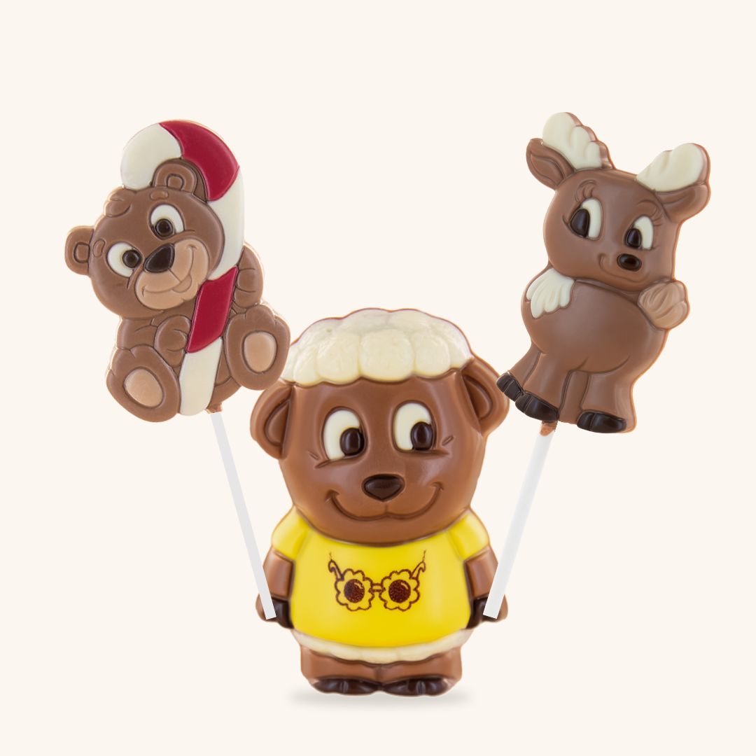 - Premium Belgian milk chocolate lollipop shaped like a festive reindeer