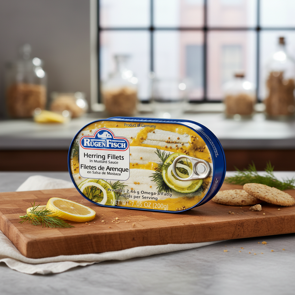 The Marine Stewardship Council herring fillets in a well-seasoned mustard cream sauce.