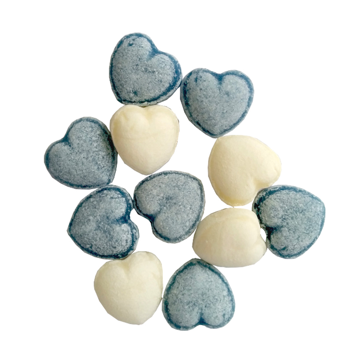 - Heart-shaped hard candies with blueberry & cool “ice” flavor