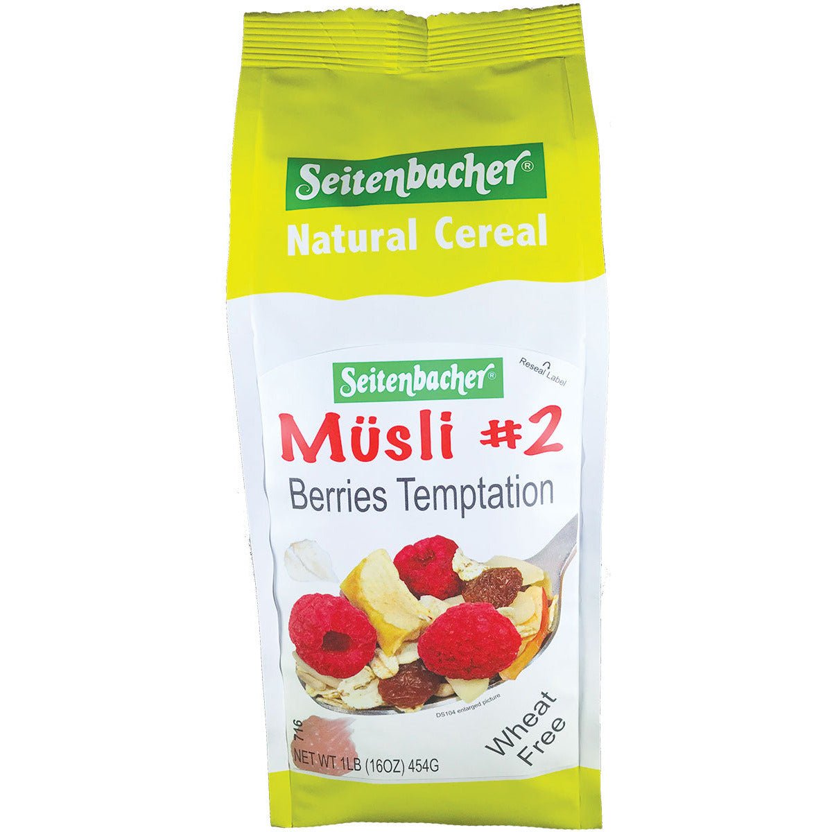 Seitenbacher #2 Berriers Temptation Muesli is a wheat-free breakfast, loaded with raspberries. It's a good source of iron and your favorite, healthy meal. A woman's choice. No artificial preservatives or colors. It is: vegan, wheat free, source of iron, fiber, protein, no trans fat and cholesterol free.